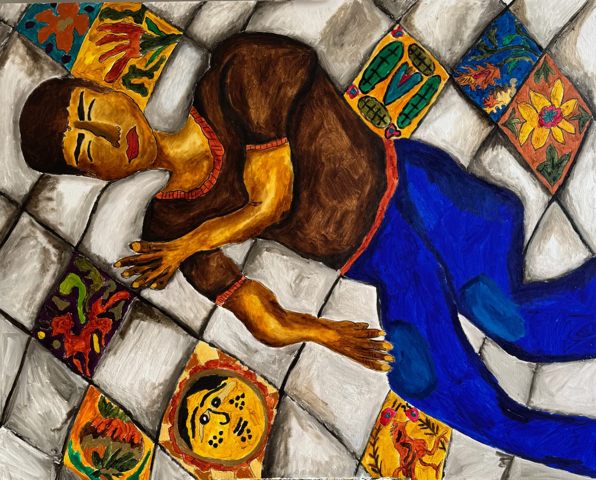 Silence grows vines, folds into tiles, opens as flowers, hardens into stars. Bodies turn into landscapes; patterns turn into a language. Color carries what the mouth withholds.