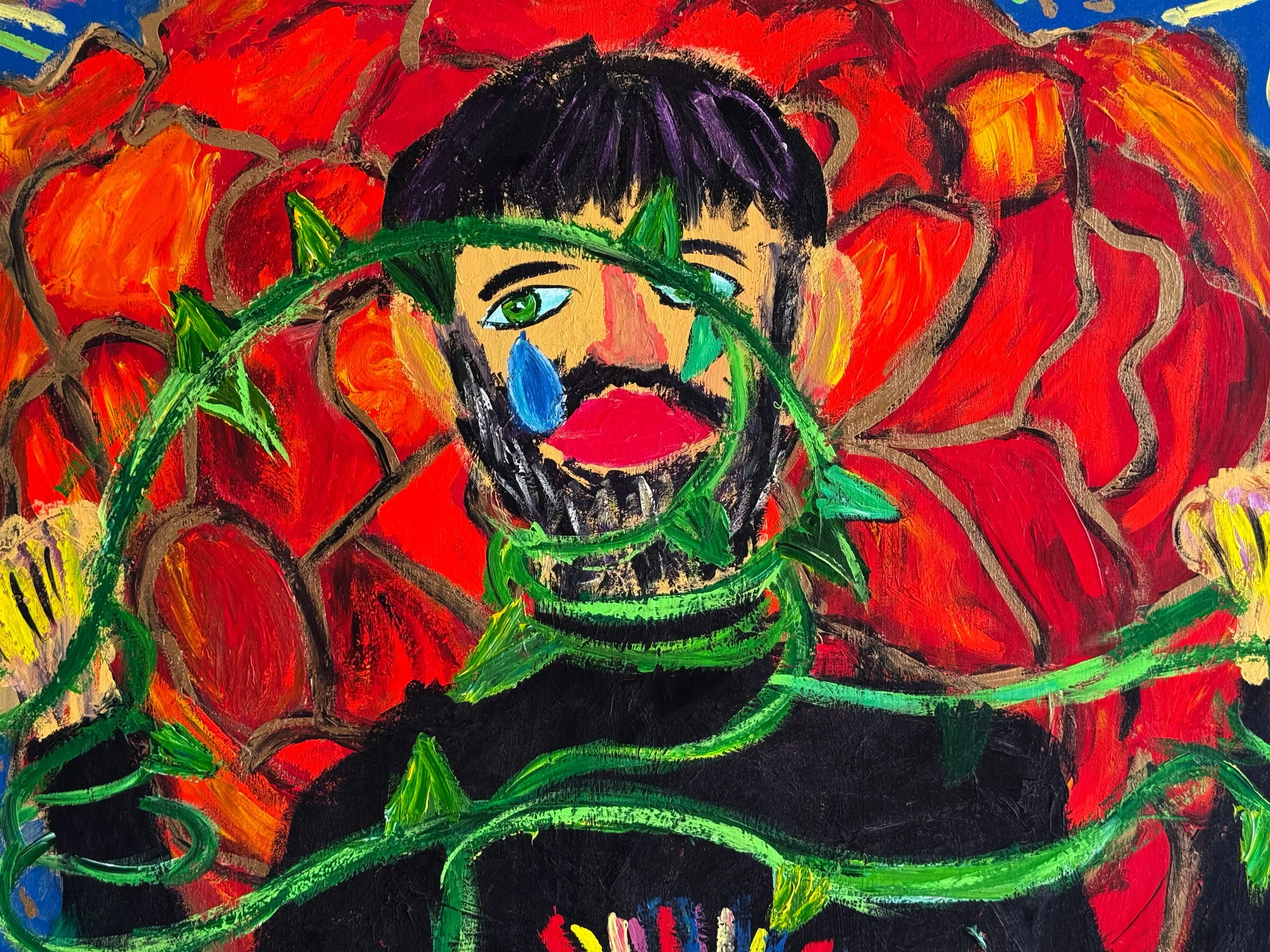 I paint quickly and honestly—thick acrylic, blunt shapes, a childlike line that refuses to flatter. The motifs come from the places that hold me together: the ornamental alphabets of the Levant—textiles, tiles, garden tulips, prayer-like repetitions. I borrow their discipline and let feeling disturb it. Red pushes into blue, yellow stains the skin, green insists on life. Each canvas is an interior room: part sanctuary, part storm.